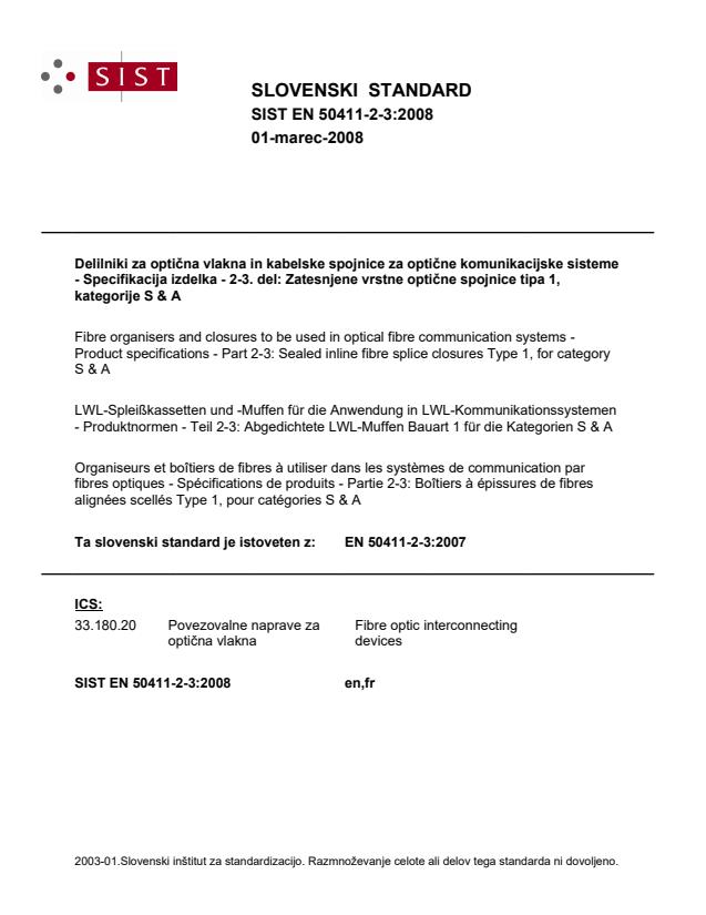 2003-01.Slovenski inštitut za standardizacijo. Razmnoževanje celote ali delov tega standarda ni dovoljeno.Fibre organisers and closures to be used in optical fibre communication systems - Product specifications - Part 2-3: Sealed inline fibre splice closures Type 1, for category S & AOrganiseurs et boîtiers de fibres à utiliser dans les systèmes de communication par fibres optiques - Spécifications de produits - Partie 2-3: Boîtiers à épissures de fibres alignées scellés Type 1, pour catégories S & ALWL-Spleißkassetten und -Muffen für die Anwendung in LWL-Kommunikationssystemen - Produktnormen - Teil 2-3: Abgedichtete LWL-Muffen Bauart 1 für die Kategorien S & ATa slovenski standard je istoveten z:EN 50411-2-3:2007SIST EN 50411-2-3:2008en,fr33.180.20Fibre optic interconnecting devicesICS:SLOVENSKI