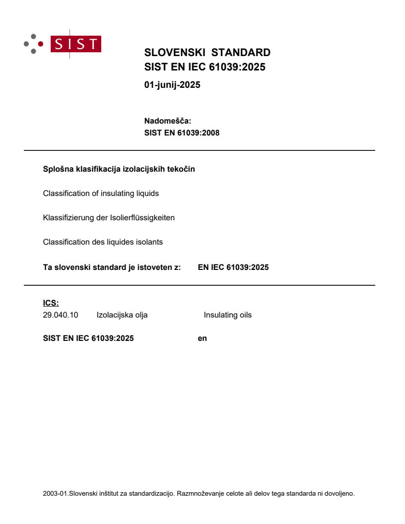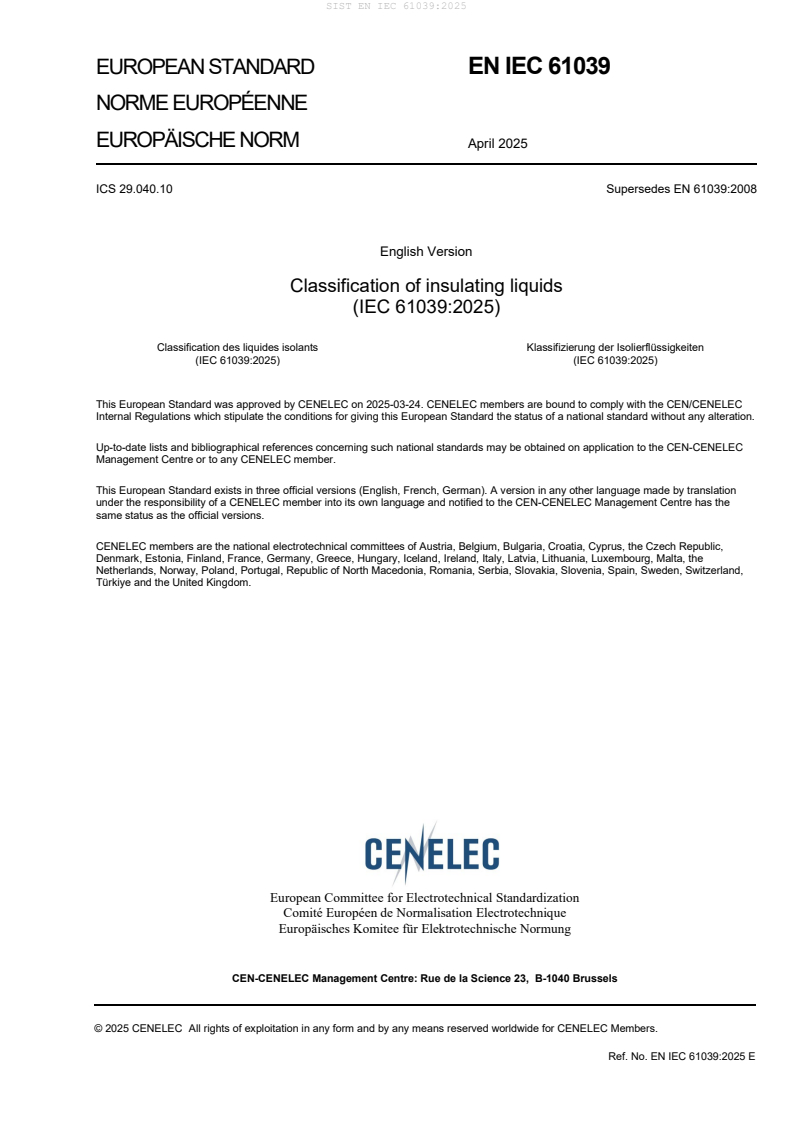 Keywords: EN IEC 61039:2025, classification of insulating liquids, insulating oils, IEC 61039, ISO 8681, ISO 6743-99, transformer oil, mineral oil, synthetic ester, biodegradability, CENELEC.