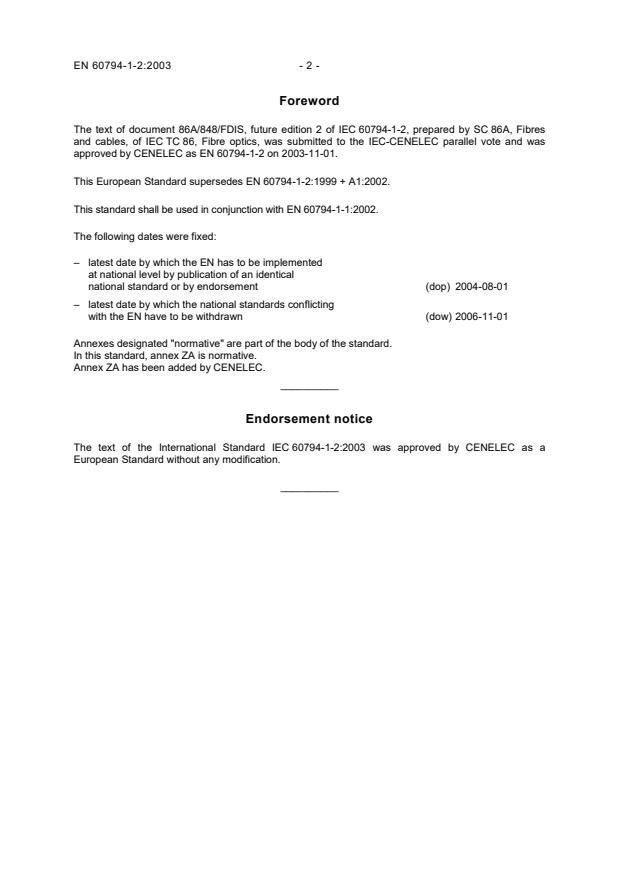 In this standard, annex ZA is normative. Annex ZA has been added by CENELEC. __________ Endorsement notice The text of the International Standard IEC 60794-1-2:2003 was approved by CENELEC as a European Standard without any modification. __________