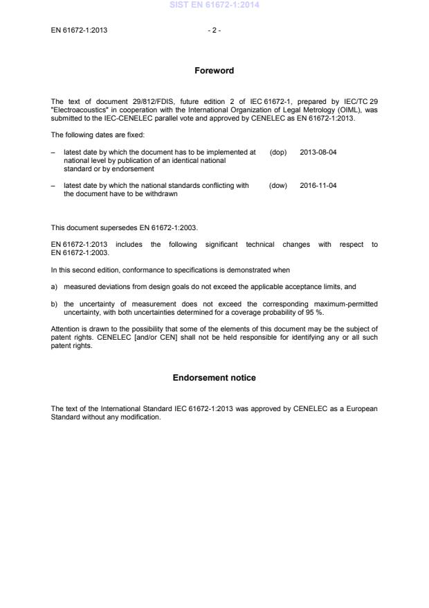 EN 61672-1:2013 is a standard published by CLC. Its full title is "Electroacoustics - Sound level meters - Part 1: Specifications". This standard covers: IEC 61672-1:2013 gives electroacoustical performance specifications for three kinds of sound measuring instruments: - time-weighting sound level meters that measure exponential-time-weighted, frequency-weighted sound levels; - integrating-averaging sound level meters that measure time-averaged, frequency-weighted sound levels; and - integrating sound level meters that measure frequency-weighted sound exposure levels. Sound level meters specified in this standard are intended to measure sounds generally in the range of human hearing. Two performance categories, class 1 and class 2, are specified in this standard. Acceptance limits for class 2 are greater than, or equal to, those for class 1. This standard is applicable to a range of designs for sound level meters. A sound level meter may be a self-contained hand-held instrument with an attached microphone and a built-in display device. A sound level meter may be comprised of separate components in one or more enclosures and may be capable of displaying a variety of acoustical signal levels. Sound level meters may include extensive analogue or digital signal processing, separately or in combination, with multiple analogue and digital outputs. Sound level meters may include general-purpose computers, recorders, printers, and other devices that form a necessary part of the complete instrument. Sound level meters may be designed for use with an operator present or for automatic and continuous measurements of sound level without an operator present. Specifications in this standard for the response to sound waves apply without an operator present in the sound field. This second edition cancels and replaces the first edition published in 2002. It constitutes a technical revision. In this second edition, conformance to specifications is demonstrated when measured deviations from design goals do not exceed the applicable acceptance limits, and when the uncertainty of measurement does not exceed the corresponding maximum-permitted uncertainty, with both uncertainties determined for a coverage probability of 95 %.