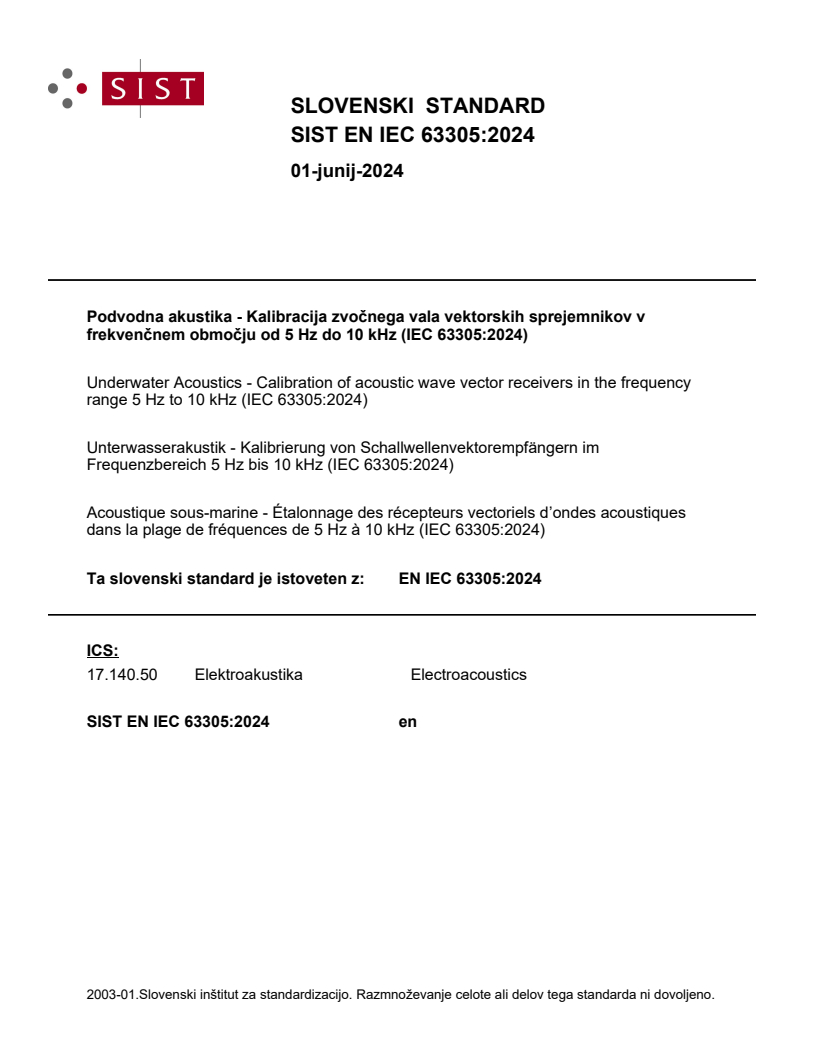 Podvodna akustika - Kalibracija zvočnega vala vektorskih sprejemnikov v frekvenčnem območju od 5 Hz do 10 kHz (IEC 63305:2024)