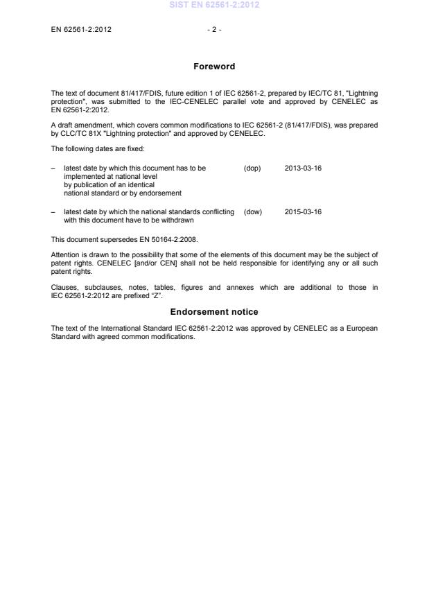 Foreword The text of document 81/417/FDIS, future edition 1 of IEC 62561-2, prepared by IEC/TC 81, "Lightning protection", was submitted to the IEC-CENELEC parallel vote and approved by CENELEC as EN 62561-2:2012. A draft amendment, which covers common modifications to IEC 62561-2 (81/417/FDIS), was prepared by CLC/TC 81X "Lightning protection" and approved by CENELEC. The following dates are fixed: – latest date by which this document has to be implemented at national level by publication of an identical national standard or by endorsement (dop) 2013-03-16 – latest date by which the national standards conflicting with this document have to be withdrawn (dow) 2015-03-16 This document supersedes EN 50164-2:2008. Attention is drawn to the possibility that some of the elements of this document may be the subject of patent rights. CENELEC [and/or CEN] shall not be held responsible for identifying any or all such patent rights. Clauses, subclauses, notes, tables, figures and annexes which are additional to those in IEC 62561-2:2012 are prefixed “Z”. Endorsement notice The text of the International Standard IEC 62561-2:2012 was approved by CENELEC as a European Standard with agreed common modifications. SIST EN 62561-2:2012