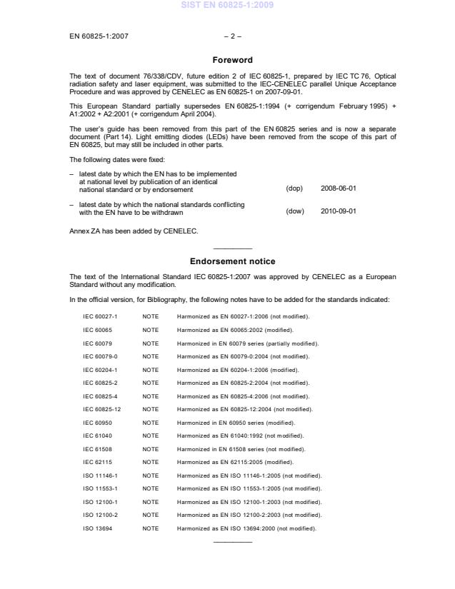 2010-09-01 Annex ZA has been added by CENELEC. __________ Endorsement notice The text of the International Standard IEC 60825-1:2007 was approved by CENELEC as a European Standard without any modification. In the official version, for Bibliography, the following notes have to be added for the standards indicated: IEC 60027-1 NOTE Harmonized as EN 60027-1:2006 (not modified). IEC 60065 NOTE Harmonized as EN 60065:2002 (modified). IEC 60079 NOTE Harmonized in EN 60079 series (partially modified). IEC 60079-0 NOTE Harmonized as EN 60079-0:2004 (not modified). IEC 60204-1 NOTE Harmonized as EN 60204-1:2006 (modified). IEC 60825-2 NOTE Harmonized as EN 60825-2:2004 (not modified). IEC 60825-4 NOTE Harmonized as EN 60825-4:2006 (not modified). IEC 60825-12 NOTE Harmonized as EN 60825-12:2004 (not modified). IEC 60950 NOTE Harmonized in EN 60950 series (modified). IEC 61040 NOTE Harmonized as EN 61040:1992 (not modified). IEC 61508 NOTE Harmonized in EN 61508 series (not modified). IEC 62115 NOTE Harmonized as EN 62115:2005 (modified). ISO 11146-1 NOTE Harmonized as EN ISO 11146-1:2005 (not modified). ISO 11553-1 NOTE Harmonized as EN ISO 11553-1:2005 (not modified). ISO 12100-1 NOTE Harmonized as EN ISO 12100-1:2003 (not modified). ISO 12100-2 NOTE Harmonized as EN ISO 12100-2:2003 (not modified). ISO 13694 NOTE Harmonized as EN ISO 13694:2000 (not modified). __________ SIST EN 60825-1:2009