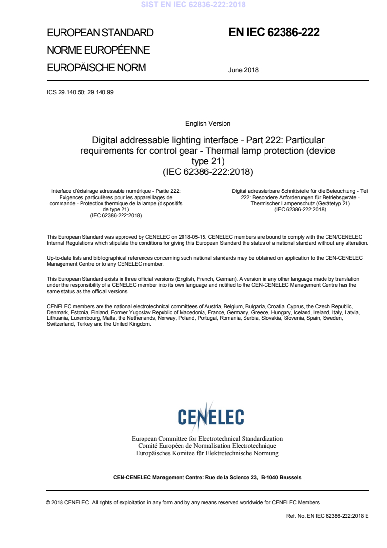Keywords: EN IEC 62386-222:2018, IEC 62386-222, digital addressable lighting interface, DALI, thermal lamp protection, device type 21, control gear, IEC 61347.