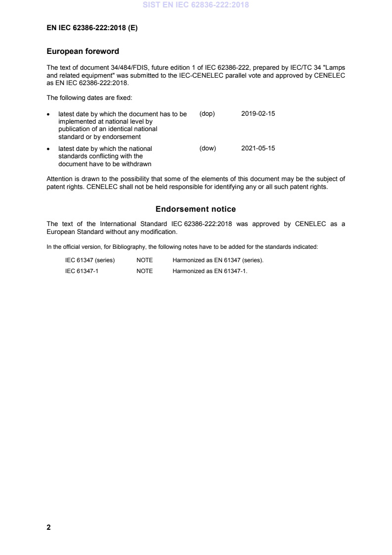 EN IEC 62386-222:2018 (IEC 62386-222:2018) is a part of the Digital Addressable Lighting Interface (DALI) family that specifies particular requirements for control gear implementing thermal lamp protection (device type 21). The standard defines a bus-based digital control system for electronic lighting equipment in line with the requirements of IEC 61347 and extends support to DC supplies. It was adopted by CENELEC as a European standard to ensure interoperable, addressable control gear behavior for thermal protection of lamps.