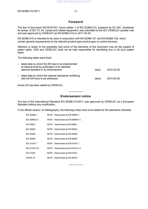 2014-05-25 Annex ZA has been added by CENELEC. __________ Endorsement notice The text of the International Standard IEC 62386-210:2011 was approved by CENELEC as a European Standard without any modification. In the official version, for Bibliography, the following notes have to be added for the standards indicated: IEC 60598-1 NOTE