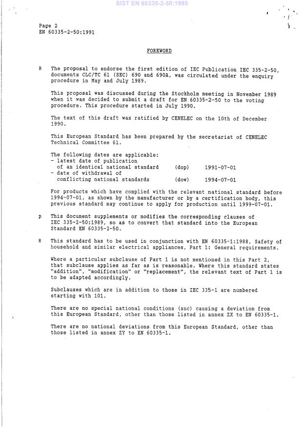 EN 60335-2-50:1991/A1:1992 is associated with the following European legislation: EU Directives/Regulations: 2006/95/EC, 73/23/EEC. When a standard is cited in the Official Journal of the European Union, products manufactured in conformity with it benefit from a presumption of conformity with the essential requirements of the corresponding EU directive or regulation.