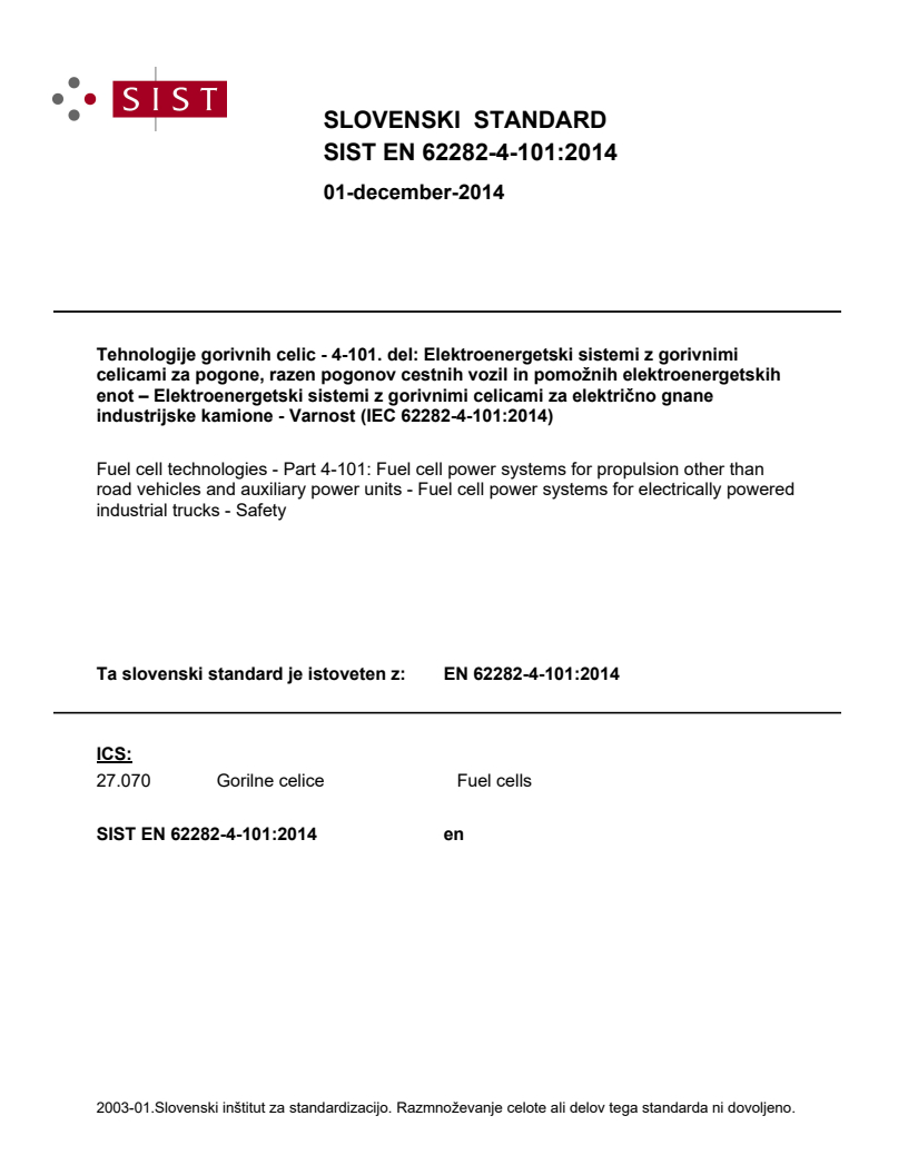 Tehnologije gorivnih celic - 4-101. del: Elektroenergetski sistemi z gorivnimi celicami za pogone, razen pogonov cestnih vozil in pomožnih elektroenergetskih enot – Elektroenergetski sistemi z gorivnimi celicami za električno gnane industrijske kamione - Varnost (IEC 62282-4-101:2014)