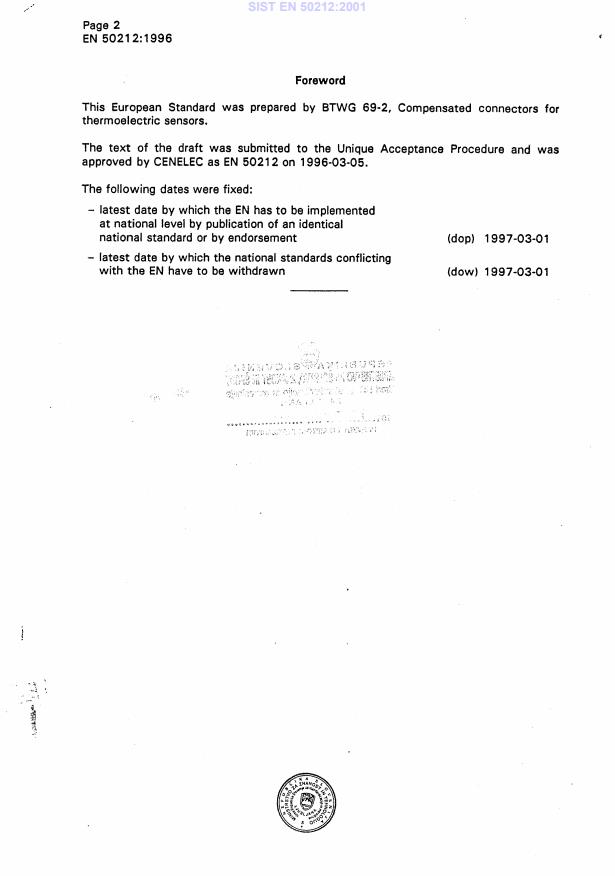 EN 50212:1996 is a standard published by CLC. Its full title is "Connectors for thermoelectric sensors". This standard covers: The object of this standard is to determine composition, nature of materials, manufacturing tests and thermoelectric behaviour, of connectors for sensors using thermocouples according to HD 446.3 S1. The latter standard does not cover such special thermocouples as U.L. and W types; nevertheless the user of such special thermocouples may use the connectors described in the standard with some restrictions mentioned in the relevant paragraphs