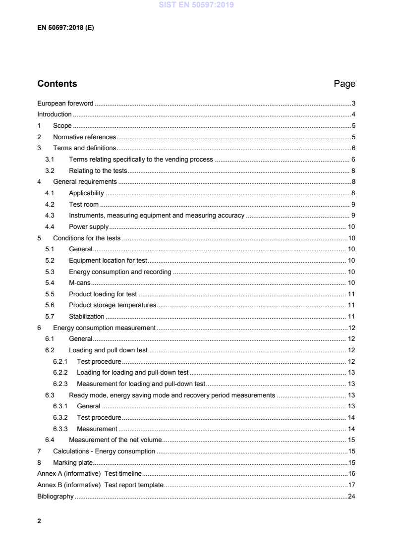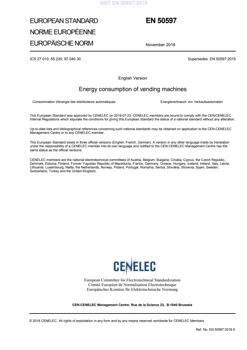 EN 50597:2018 is a standard published by CLC. Its full title is "Energy consumption of vending machines". This standard covers: This document defines methods for the measurement of energy consumption of vending machines, whether or not fitted with refrigerating appliances. The standard applies (but is not limited) to the categories shown in Table 1 of machine types. The following types of vending machine are excluded from this standard: — drink machines dispensing hot and/or cold drinks into cups; — machines with a food heating function; — vending machines operating at temperatures below 0 °C; or — any machine including one or more of these compartments. For verification purposes, it is essential to apply all of the tests specified to a single unit. The tests may also be made individually for the study of a particular characteristic. This standard does not deal with any characteristics of machine design other than energy consumption.