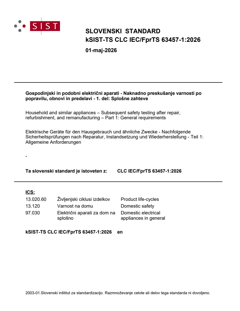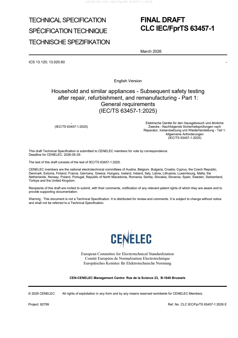 CLC IEC/FprTS 63457-1:2026 is a draft published by CLC. Its full title is "Household and similar appliances - Subsequent safety testing after repair, refurbishment, and remanufacturing - Part 1: General requirements". This standard covers: This standard is a product family standard dealing with safety after repair, refurbishment, and remanufacturing of an appliance already placed on the market and subsequent safety testing of appliances within the scope of IEC TC 61 and its subcommittees. This document takes precedence over horizontal and generic standards covering the same subject. When a Part 2 of the IEC TS 63457-2 series does not include additional requirements to cover hazards dealt with in this document, this document applies. All tests included in this document are conducted by a qualified person or by a supervised technician for specified activities. The concept of upgrade of an appliance and use of reused components are addressed in informative Annex A and informative Annex B. Additional requirements for upgrade apply as given in informative Annex B. Inspection and test documentation are prepared, for example, according to informative Annex C. Furthermore, a guidance on preparing a service manual by the manufacturer or remanufacturer is given in Annex D.