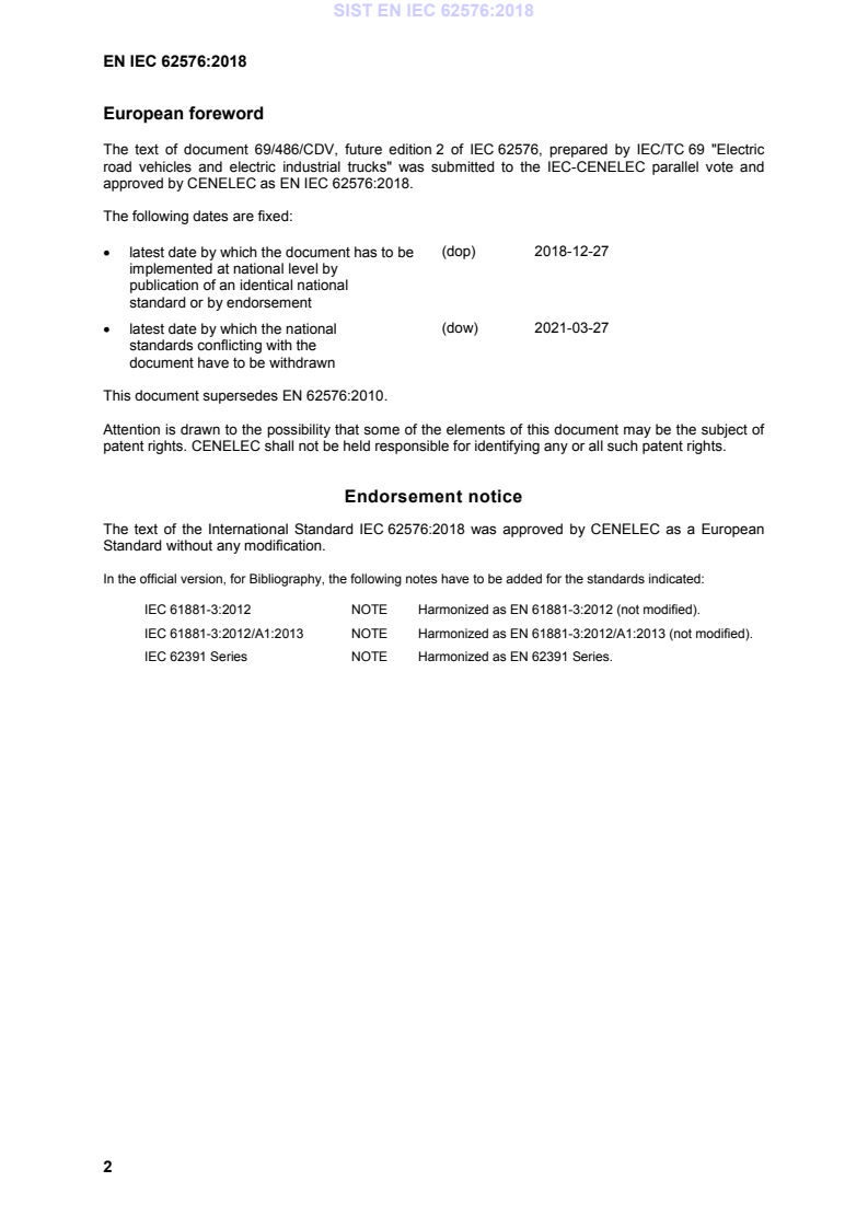 EN IEC 62576:2018 is a standard published by CLC. Its full title is "Electric double-layer capacitors for use in hybrid electric vehicles - Test methods for electrical characteristics". This standard covers: NEW!IEC 62576:2018 is available as IEC 62576:2018 RLV which contains the International Standard and its Redline version, showing all changes of the technical content compared to the previous edition. IEC 62576:2018 describes the methods for testing electrical characteristics of electric double-layer capacitor cells (hereinafter referred to as capacitor) to be used for peak power assistance in hybrid electric vehicles. This second edition cancels and replaces the first edition published in 2009. This edition constitutes a technical revision. This edition includes the following significant technical changes with respect to the previous edition: a) information on applicability of this document has been added in Clause 1; b) the definitions of some terms in Clause 3 have been improved; c) the description of test procedures in Clause 4 has been clarified; d) information on endurance cycling test has been added (Annex E).