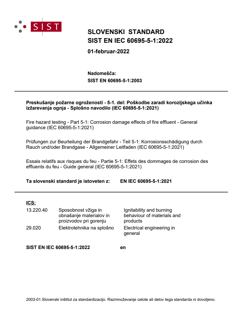 Preskušanje požarne ogroženosti - 5-1. del: Poškodbe zaradi korozijskega učinka izžarevanja ognja - Splošno navodilo (IEC 60695-5-1:2021)