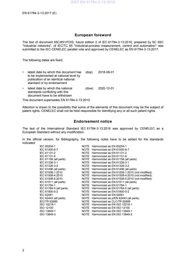 Endorsement notice The text of the International Standard IEC 61784-3-13:2016 was approved by CENELEC as a European Standard without any modification. In the official version, for Bibliography, the following notes have to be added for the standards indicated: IEC 60204-1 NOTE