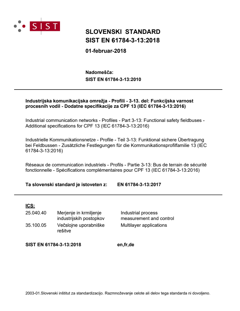 2003-01.Slovenski inštitut za standardizacijo. Razmnoževanje celote ali delov tega standarda ni dovoljeno.Industrijska komunikacijska omrežja - Profili - 3-13. del: Funkcijska varnost procesnih vodil - Dodatne specifikacije za CPF 13 (IEC 61784-3-13:2016)Industrielle Kommunikationsnetze - Profile - Teil 3-13: Funktional sichere Übertragung bei Feldbussen - Zusätzliche Festlegungen für die Kommunikationsprofilfamilie 13 (IEC 61784-3-13:2016)Réseaux de communication industriels - Profils - Partie 3-13: Bus de terrain de sécurité fonctionnelle - Spécifications complémentaires pour CPF 13 (IEC 61784-3-13:2016)Industrial communication networks - Profiles - Part 3-13: Functional safety fieldbuses - Additional specifications for CPF 13 (IEC 61784-3-13:2016)35.100.05UHãLWYHMultilayer applications25.040.40Merjenje in krmiljenje industrijskih postopkovIndustrial process measurement and controlICS:Ta slovenski standard je istoveten z:EN 61784-3-13:2017SIST EN 61784-3-13:2018en,fr,de01-februar-2018SIST EN 61784-3-13:2018SLOVENSKI