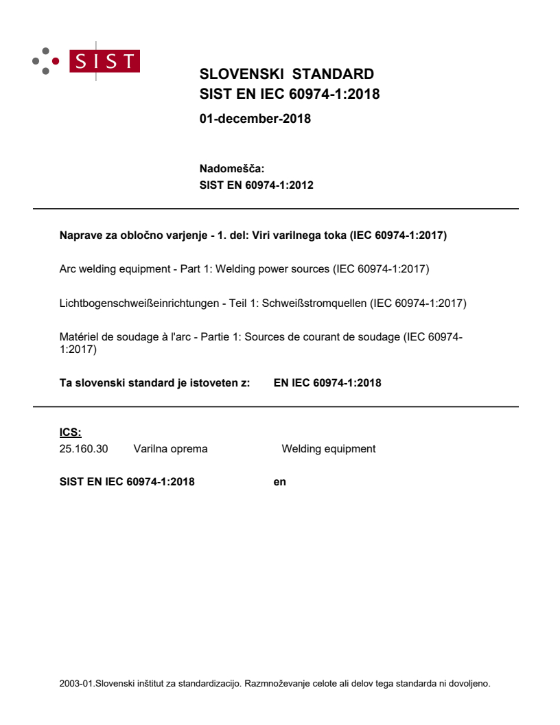 Ta del standarda IEC 60974-1:2012 se uporablja za vire toka za obločno varjenje in z njim povezane postopke, namenjene za profesionalno in industrijsko uporabo, ki se napajajo z napetostjo, manjšo od 1000 V, ali jih poganjajo mehanska sredstva. Ta del standarda IEC 60974 določa zahteve glede varnosti in zmogljivosti za vire varilnega toka in plazemske rezalne sisteme. Ta četrta izdaja razveljavlja in nadomešča tretjo izdajo, objavljeno leta 2005, in predstavlja tehnično popravljeno izdajo. Pomembne spremembe glede na predhodno različico: – preskus segrevanja je treba izvesti pri temperaturi okolice 40 ° C (glej 5.1); – nova Slika 1 povzema primer zahtev glede izolacije; – plazilne razdalje za stopnjo onesnaženosti 4 niso več veljavne (glej preglednico 2); – podane so zahteve glede izolacije opreme razreda II (glej preglednico 3); – spodnja omejitvena vrednost napetostne interpolacije pri dielektričnih preskusih je spremenjena v 220 V in pojasnjena je interpolacija za kontrolni in varilni tokokrog (glej preglednico 4); – vodni preskus je pojasnjen z zadušitvijo vizualnega pregleda (glej 6.2.1); –zahteve glede izolacije napajalnega tokokroga in varilnega tokokroga so premaknjene v zaščito pred električnim udarom pri običajni uporabi (glej 6.2.4); – spremenjene so zahteve glede toka dotika pri običajni uporabi in v razmerah posamične okvare (glej 6.2.5, 6.2.6 in 6.3.6); – največje temperaturne vrednosti za izolacijske sisteme so revidirane v skladu s trenutno izdajo standarda IEC 60085 (glej preglednico 6); – omejitve povečevanja temperature za zunanje površine so posodobljene glede na obdobje nenamernega stika, kot je opredeljeno v standardu ISO 13732-1 (glej preglednico 7); – preskus obremenitve se konča z dielektričnim preskusom (glej 7.4); – pojasnjen je preskus skladnosti za tolerance pri nihanjih napajalne napetosti (glej 10.1); – označevanje priključkov je omejeno na zunanji zaščitni prevodnik in trifazne priključke opreme (glej 10.4); – pojasnjena je uporaba naprave za zmanjševanje nevarnosti (glej 11.1); – spremenjene so zahteve za krmilna vezja (glej točko 12); – pojasnjen je udarni preskus (glej 14.2.2); – dokončani so okoljski parametri (glej dodatek M).