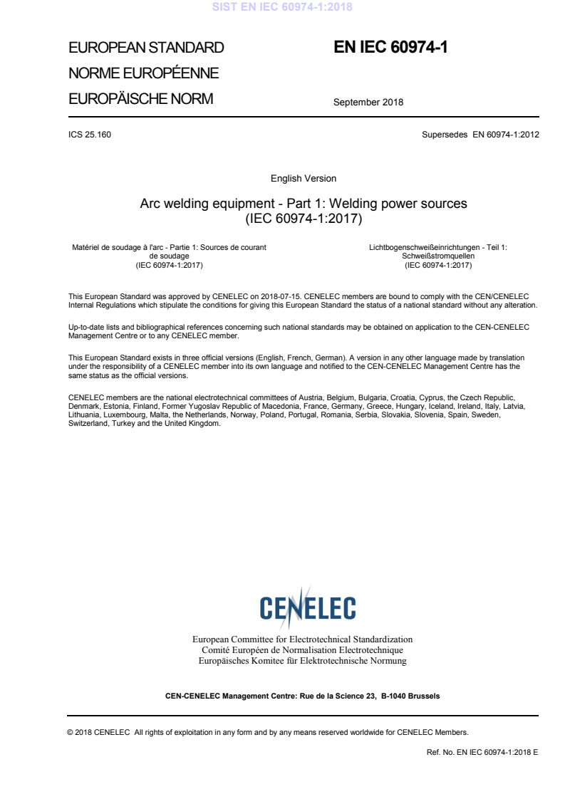 EN IEC 60974-1:2018 is a standard published by CLC. Its full title is "Arc welding equipment - Part 1: Welding power sources". This standard covers: IEC 60974-1:2012 is applicable to power sources for arc welding and allied processes designed for industrial and professional use, and supplied by a voltage not exceeding 1 000 V, or driven by mechanical means. This part of IEC 60974 specifies safety and performance requirements of welding power sources and plasma cutting systems. This fourth edition cancels and replaces the third edition published in 2005 and constitutes a technical revision. The significant changes with respect to the previous edition are the following: - the heating test shall be carried out at ambient temperature of 40 °C (see 5.1); - new Figure 1 summarizes example of insulation requirements; - creepage distances for pollution degree 4 are no longer valid (see Table 2); - insulation requirements for Class II equipment are defined (see Table 3); - dielectric test voltage interpolation restriction lower limit is changed to 220 V and interpolation for control and welding circuit is clarified (see Table 4); - water test is clarified by suppression of visual inspection (see 6.2.1); - isolation requirements of the supply circuit and the welding circuit are moved in protection against electric shock in normal service (see 6.2.4); - touch current in normal service and in single fault condition requirements are changed (see 6.2.5, 6.2.6 and 6.3.6); - maximum temperature for insulation systems are reviewed in accordance with current edition of IEC 60085 (see Table 6); - limits of temperature rise for external surfaces are updated depending of unintentional contact period as defined in ISO 13732-1 (see Table 7); - loading test is completed by a dielectric test (see 7.4); - conformity test for tolerance to supply voltage fluctuation is clarified (see 10.1); - marking of terminals is limited to external protective conductor and three-phase equipment terminals (see 10.4); - usage of hazard reducing device is clarified (see 11.1); - requirements for control circuits are changed (see Clause 12); - impact test is clarified (see 14.2.2); - environmental parameters are completed (see Annex M).