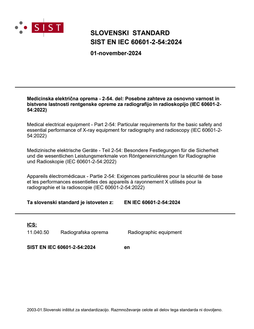 Medicinska električna oprema - 2-54. del: Posebne zahteve za osnovno varnost in bistvene lastnosti rentgenske opreme za radiografijo in radioskopijo (IEC 60601-2-54:2022)