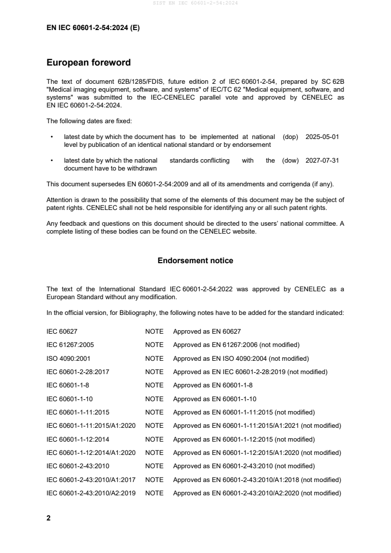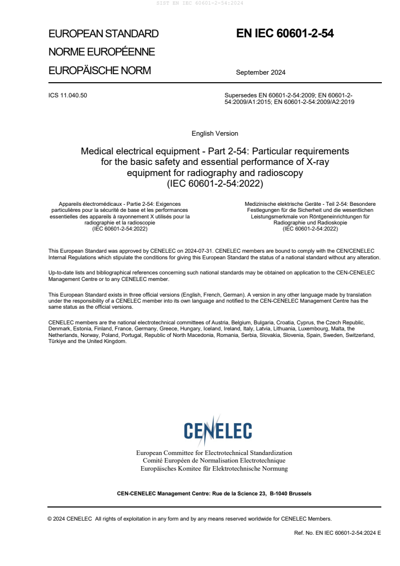 EN IEC 60601-2-54:2024 is a standard published by CLC. Its full title is "Medical electrical equipment - Part 2-54: Particular requirements for the basic safety and essential performance of X-ray equipment for radiography and radioscopy". This standard covers: IEC 60601-2-54:2022 is available as IEC 60601-2-54:2022 RLV which contains the International Standard and its Redline version, showing all changes of the technical content compared to the previous edition.IEC 60601-2-54:2022 applies to the BASIC SAFETY and ESSENTIAL PERFORMANCE of ME EQUIPMENT and ME SYSTEMS intended to be used for projection RADIOGRAPHY and INDIRECT RADIOSCOPY. IEC 60601-2-43 applies to ME EQUIPMENT and ME SYSTEMS intended to be used for interventional applications and refers to applicable requirements in this document. ME EQUIPMENT and ME SYSTEMS intended to be used for bone or tissue absorption densitometry, computed tomography, mammography or dental or radiotherapy applications are excluded from the scope of this document. The scope of this document also excludes radiotherapy simulators. If a clause or subclause is specifically intended to be applicable to ME EQUIPMENT only, or to ME SYSTEMS only, the title and content of that clause or subclause will say so. If that is not the case, the clause or subclause applies both to ME EQUIPMENT and to ME SYSTEMS, as relevant. IEC 60601-2-54:2022 edition cancels and replaces the first edition published in 2009, Amendment 1:2015 and Amendment 2:2018. This edition constitutes a technical revision. This edition includes editorial and technical changes to reflect the IEC 60601 1:2005/AMD2:2020. It also contains corrections and technical improvements. Significant technical changes with respect to the previous edition are as follows: a) a new specific term DOSIMETER is introduced to replace the general term DOSEMETER; b) terms and definitions taken exclusively from IEC TR 60788:2004 and which are specifically applicable in this document have been moved to 201.3; c) the collateral standards IEC 60601-1-11:2015, IEC 60601-1-11:2015/AMD1:2020, IEC 60601-1-12:2014 and IEC 60601-1-12:2014/AMD1:2020 are applicable if MANUFACTURER so declares; d) the subclause 201.11.101 “Protection against excessive temperatures of X-ray tube assemblies” has been removed from this document as its requirements are sufficiently and clearly covered by IEC 60601-1:2005, IEC 60601-1:2005/AMD1:2012, IEC 60601-1:2005/AMD2:2020 and IEC 60601-2-28:2017; e) to adopt changes which are introduced with respect to indicator lights in 7.8.1 of the IEC 60601-1:2005/AMD2:2020 clarification of requirements is provided to avoid conflicts with requirements of indicator lights stipulated for X-RAY EQUIPMENT; f) explanation of the term ESSENTIAL PERFORMANCE is provided in Annex AA to emphasize the performance of the clinical function under NORMAL and SINGLE FAULT CONDITIONS. CONDITIONS.