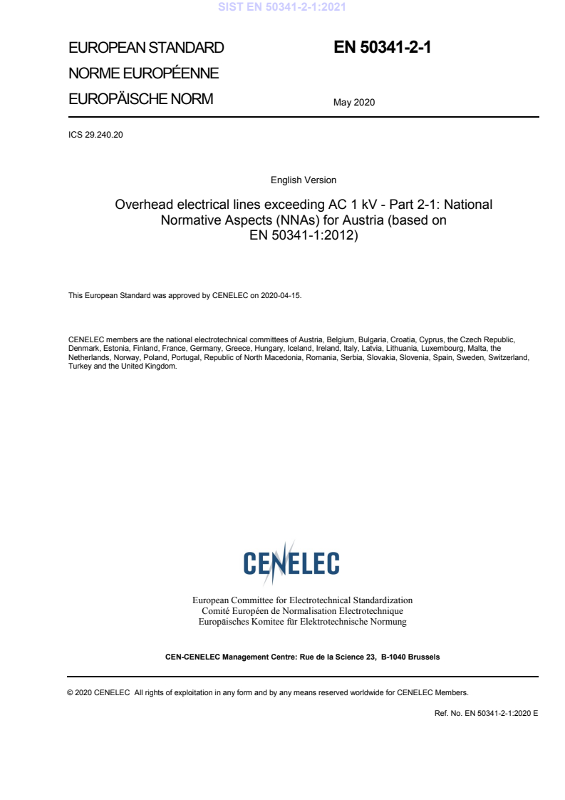 EN 50341-2-1:2020 is a standard published by CLC. Its full title is "Overhead electrical lines exceeding AC 1 kV - Part 2-1: National Normative Aspects (NNAs) for Austria (based on EN 50341-1:2012)". This standard covers: 2020-05-14: no xml because NNA document 2021: CLC legacy converted by DCLab NISOSTS
