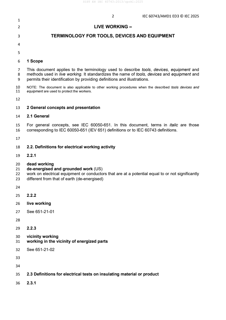 - Scope and applicability: Terminology for tools, devices, equipment and methods used in live working. The document also applies to other procedures when these items protect workers.