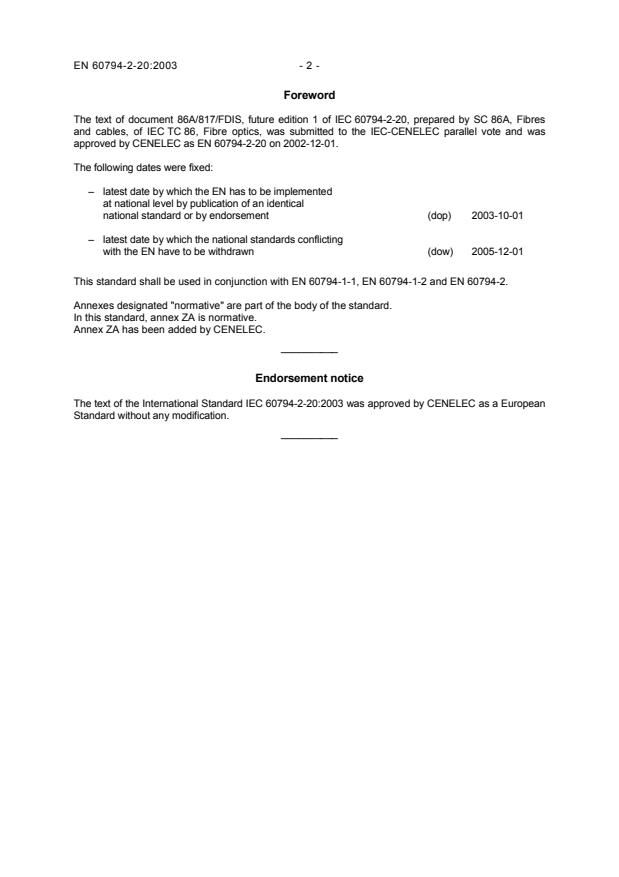The text of the International Standard IEC 60794-2-20:2003 was approved by CENELEC as a European