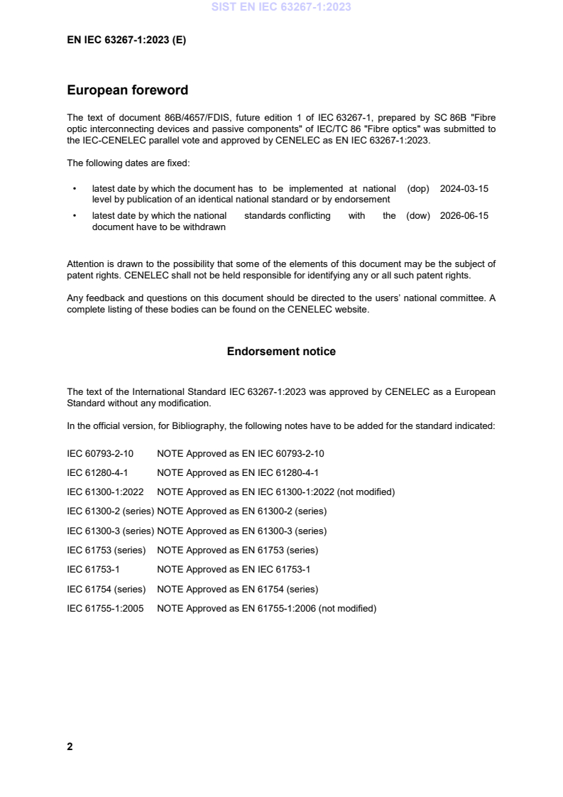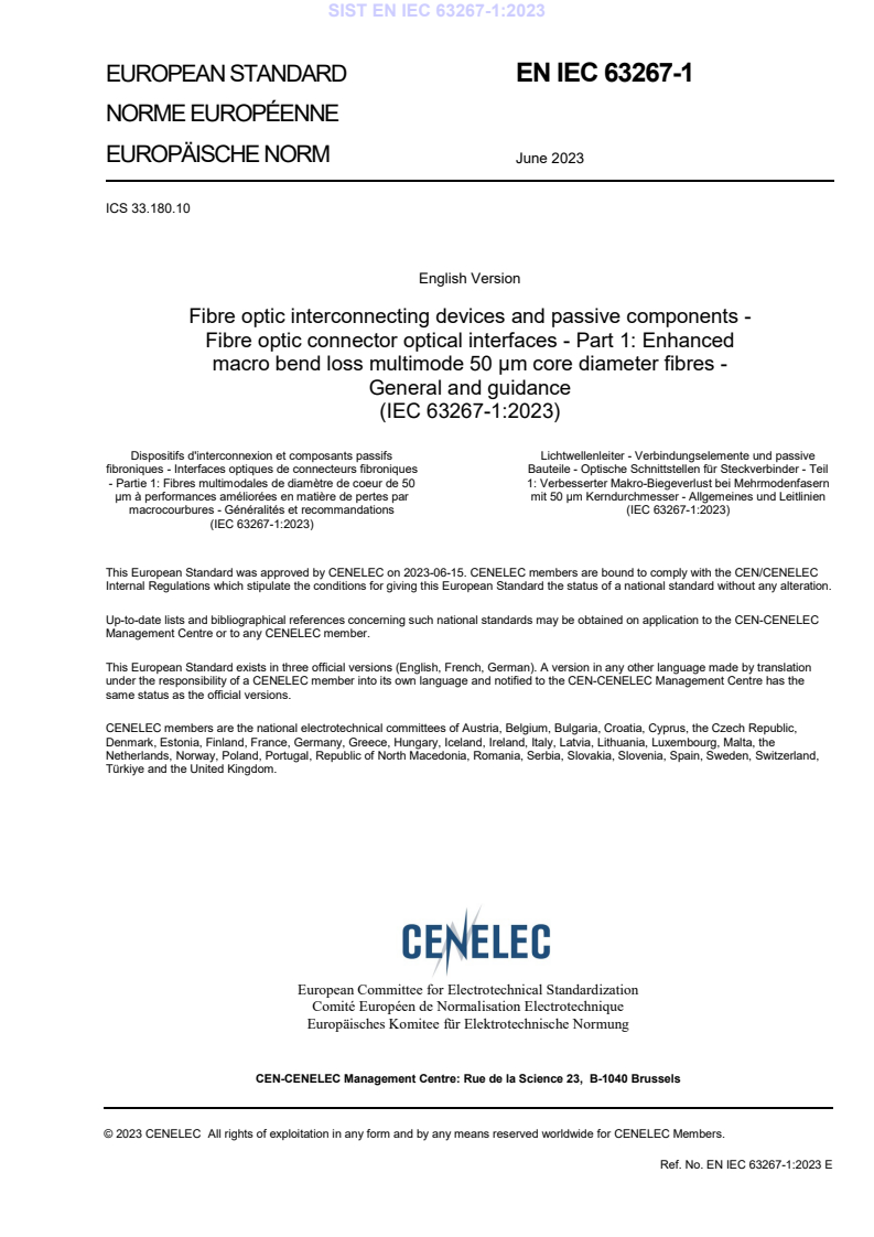 EN IEC 63267-1:2023 (CLC adoption of IEC 63267-1:2023) defines optical interface requirements and guidance for enhanced macro bend loss multimode fibres with 50 µm core diameter. It is the Part 1, general and guidance document of the IEC 63267 series and covers the scope, document structure, definitions and the framework for standardised fibre optic connector optical interfaces. The standard focuses on multimode connector interfaces at the 850 nm band (IEC 60793-2-10 subcategories A1‑OM2b to A1‑OM5b) and was approved by CENELEC in June 2023.