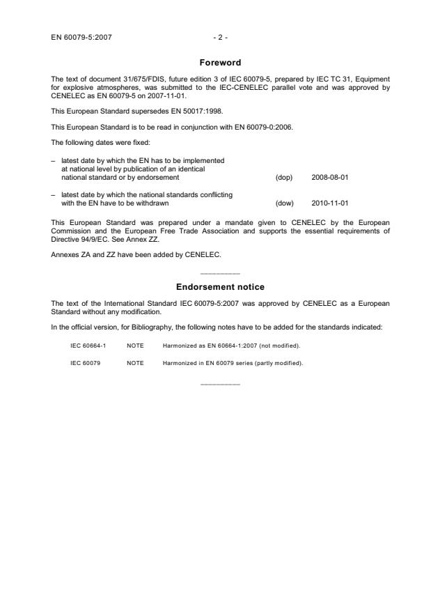 EN 60079-5:2007 has the following relationships with other standards: It is inter standard links to EN 50017:1998, EN 60079-5:2015. Understanding these relationships helps ensure you are using the most current and applicable version of the standard.