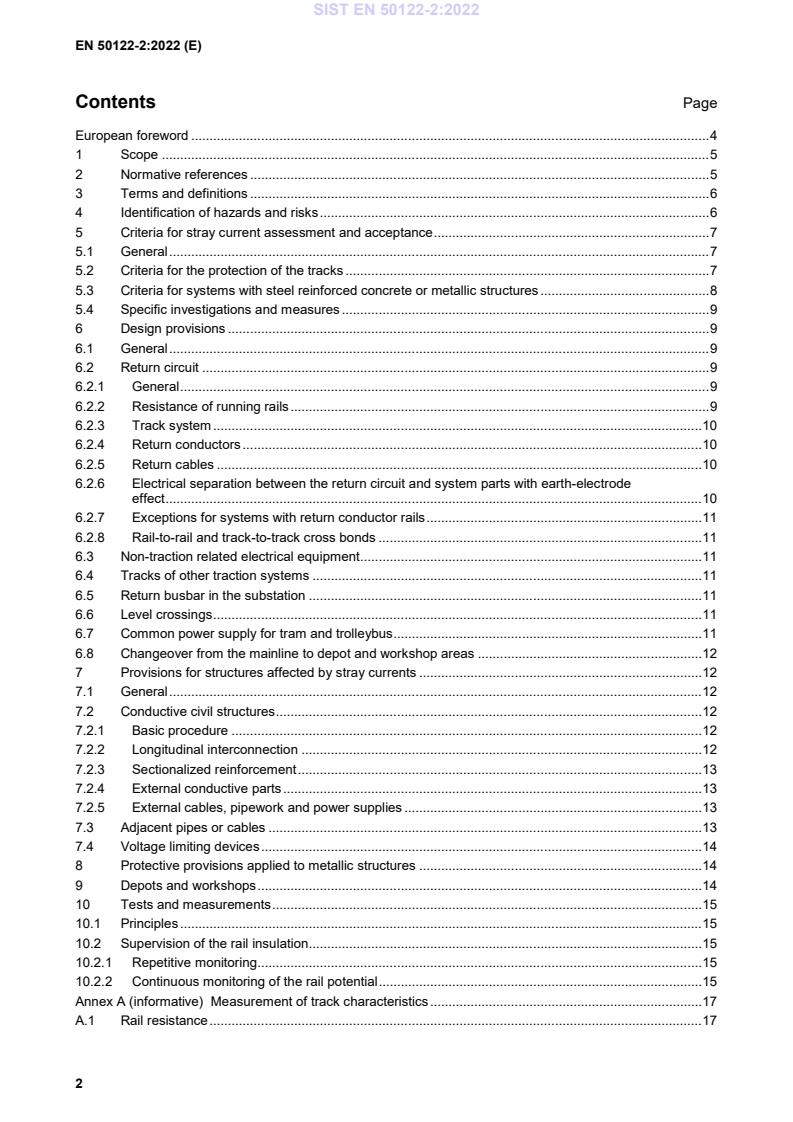 EN 50122-2:2022 (CLC) - Railway applications - Fixed installations - Electrical safety, earthing and the return circuit - Part 2 - specifies protective provisions against the effects of stray currents caused by DC traction systems. The standard applies to all metallic fixed installations and other conductive parts in the earth that can carry stray currents from DC railway power supplies. It covers new DC lines and major revisions to existing DC systems and provides design requirements (not maintenance working rules) to enable safe operation and maintainability.