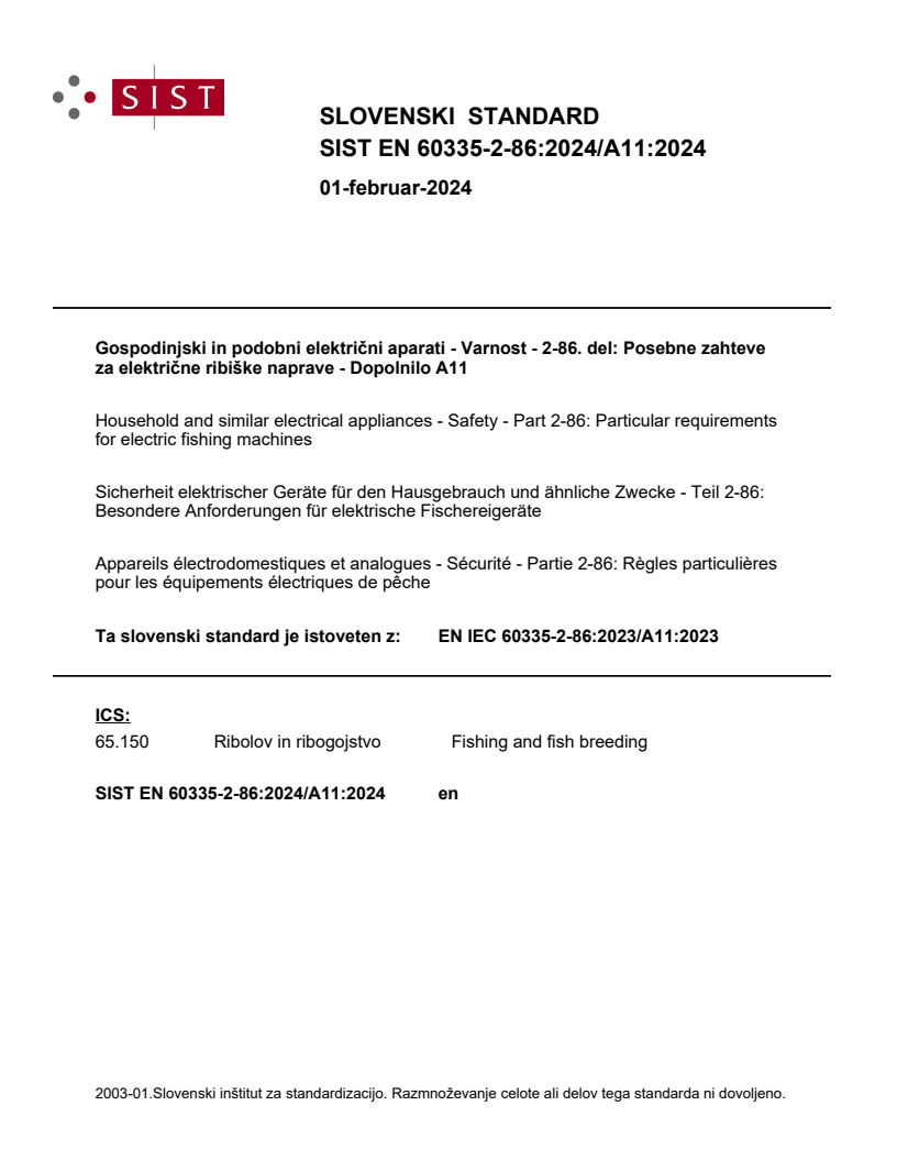 EN IEC 60335-2-86:2023/A11:2023 is a CLC (CENELEC) European amendment that updates the safety requirements for electric fishing machines - devices that electrify water to catch fish or create electric fish barriers. This amendment (A11) supplements EN IEC 60335-2-86:2023 and Part 1 safety provisions, adding specific rules for battery-operated units and machines that include a portable internal combustion engine (see Annex ZE). The standard targets safety, marking, instructions, construction, noise and vibration control, and national deviations.