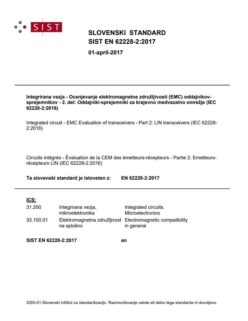Integrirana vezja - Ocenjevanje elektromagnetne združljivosti (EMC) oddajnikov-sprejemnikov - 2. del: Oddajniki-sprejemniki za krajevno medvezalno omrežje (IEC 62228-2:2016)