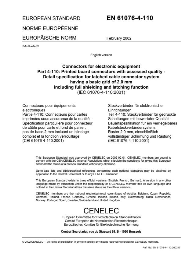 EN 61076-4-110:2002 is a European adoption of IEC 61076-4-110:2001 that defines a detail specification for latched cable connector systems for printed boards. It covers two-part printed board connectors with assessed quality, a basic grid (pitch) of 2.0 mm, and features full shielding and a latching function. This publication also carries the IECQ specification number QC 480301XX0011, linking it to the IEC Quality Assessment System for Electronic Components (IECQ).