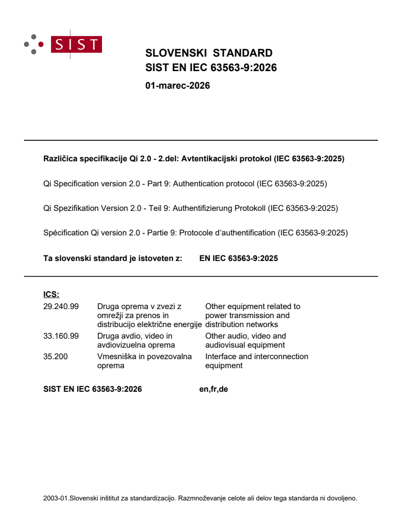 Različica specifikacije Qi 2.0 - 2.del: Avtentikacijski protokol (IEC 63563-9:2025)