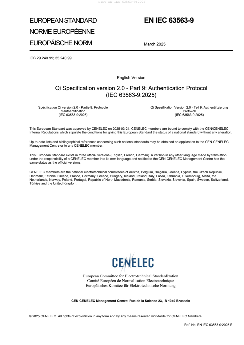 EN IEC 63563-9:2025 is a standard published by CLC. Its full title is "Qi Specification version 2.0 - Part 9: Authentication Protocol". This standard covers: IEC 63563-9:2025 defines the architecture and application-level messaging for the Authentication of a Power Transmitter Product by a Power Receiver to ensure that the Power Transmitter Product is both Qi certified and the product of a registered manufacturer.