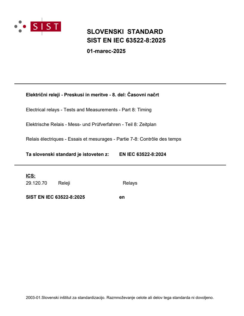 Keywords: EN IEC 63522-8:2024, electrical relays, timing tests, operate time, release time, bounce time, time relays, relay timing standard, CLC, CENELEC.