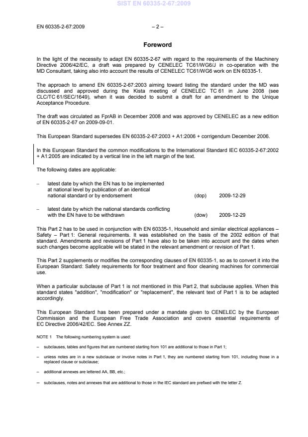 EN 60335-2-67:2009 is a standard published by CLC. Its full title is "Household and similar electrical appliances - Safety - Part 2-67: Particular requirements for floor treatment and floor cleaning machines for commercial use". This standard covers: This clause of Part 1 is replaced by the following. This International Standard deals with the safety of electric motor-operated appliances primarily designed for industrial and commercial use, with or without attachments, including appliances incorporating wet and/or dry suction, their rated voltage being not more than 250 V for single-phase appliances and 480 V for other appliances. Such appliances may be used for floor polishing (including waxing and buffing), scrubbing and grinding, scarifying and carpet shampooing. NOTE 101 Commercial uses are for example for use in hotels, schools, hospitals, factories, shops and offices for other than normal housekeeping purposes. Appliances incorporating wet and/or dry suction shall also meet the appropriate requirements for industrial vacuum cleaners. This standard also applies to machines handling hazardous dust such as asbestos or liquids for which additional national requirements might apply. It is also applicable to appliances making use of other forms of energy for the motor; but it is necessary that their influence is taken into consideration.