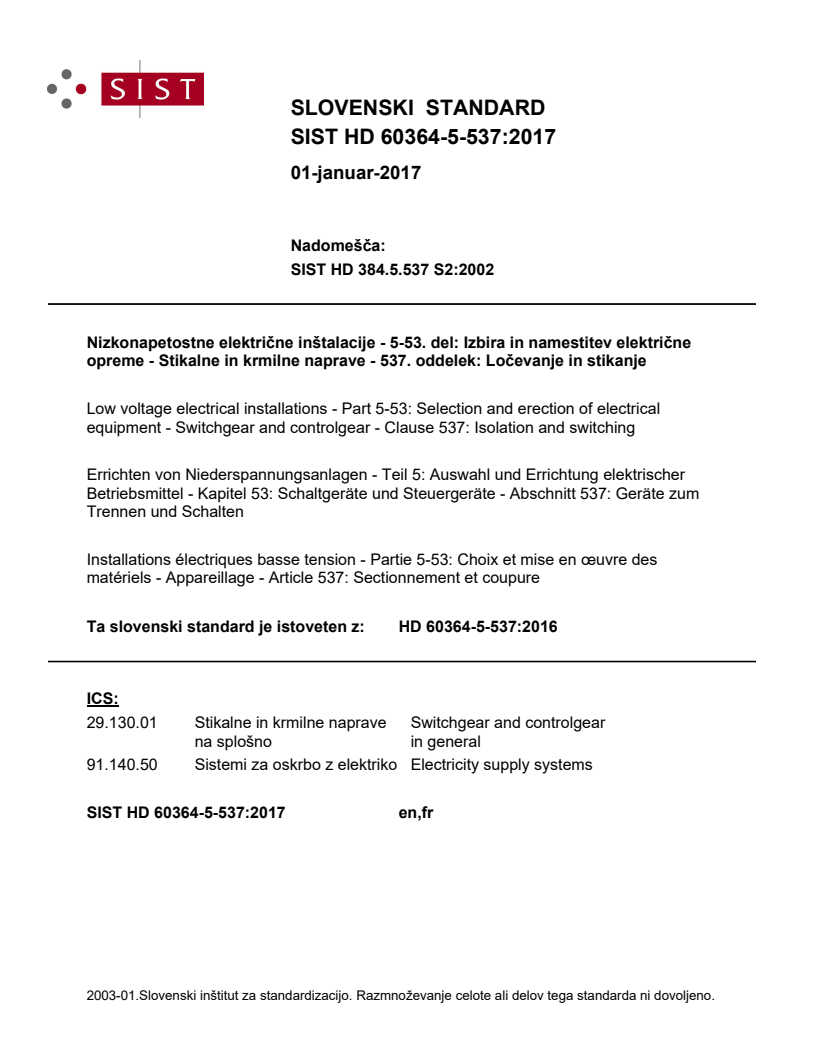 Ta slovenski standard je istoveten z: HD 60364-5-537:2016