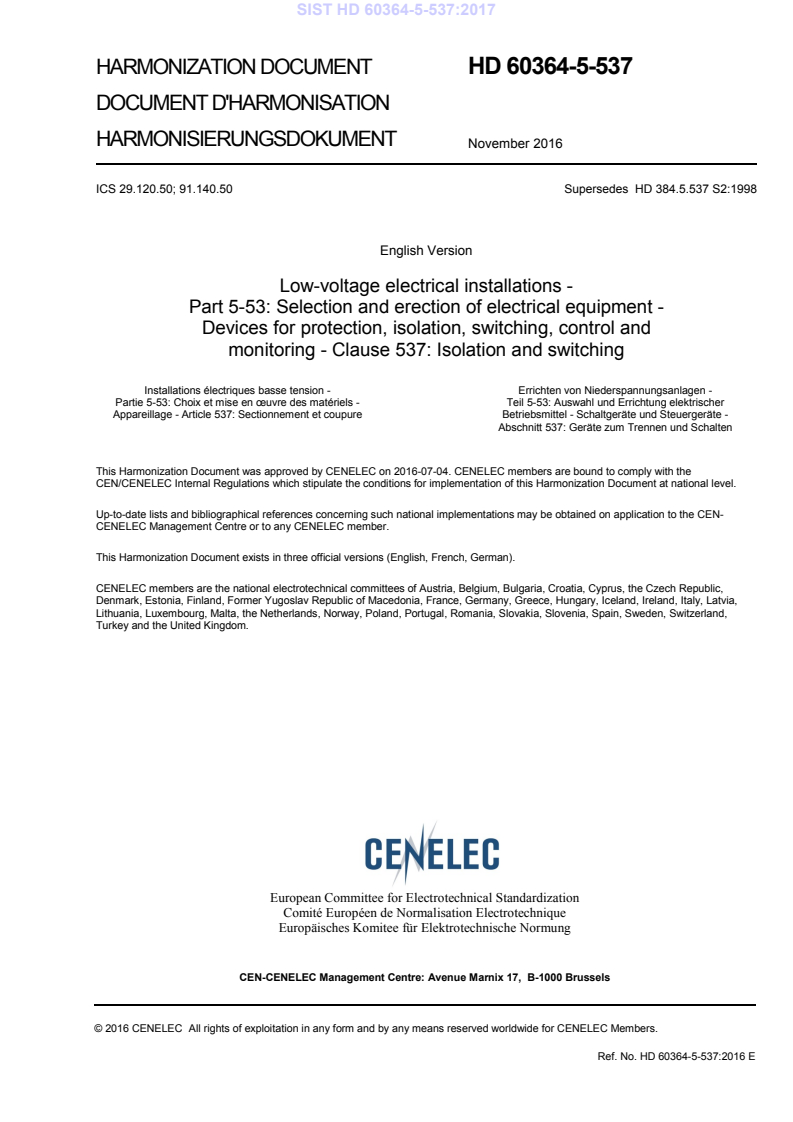 HD 60364-5-537:2016 is a standardization document published by CLC. Its full title is "Low-voltage electrical installations - Part 5-53: Selection and erection of electrical equipment - Devices for protection, isolation, switching, control and monitoring - Clause 537: Isolation and switching". This standard covers: This part of HD 60364 deals with general requirements for isolation and switching and with the requirements for selection and erection of the devices provided to fulfil such functions.