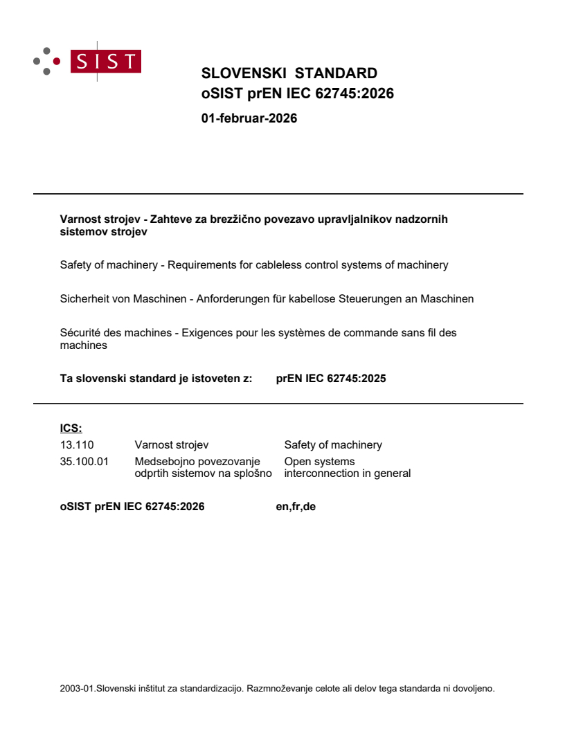 The prEN IEC 62745:2025 standard, titled Safety of Machinery - Requirements for Cableless Control Systems of Machinery, is developed by the Committee for Electrotechnical Standardization (CLC). This international standard addresses the growing use of wireless or cableless control systems (CCS) as operator interfaces for machinery. These systems replace traditional wired controls to offer enhanced flexibility, safety, and operational convenience.