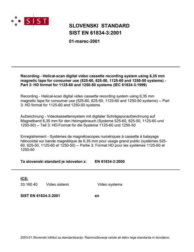 EN 61834-3:2000 (CLC adoption of IEC 61834-3:1999) defines the HD format for helical-scan digital video cassette recording systems using 6,35 mm (1/4") magnetic tape for consumer use. This Part 3 complements Parts 1 and 2 by specifying the content, format and recording method of the data blocks that form helical records for the higher-resolution systems: the 1125-line (30.00 Hz frame rate) and 1250-line (25.00 Hz frame rate) systems. The standard establishes basic principles for next‑generation consumer digital video cassette recorders (VCRs), benefitting both manufacturers and end users.