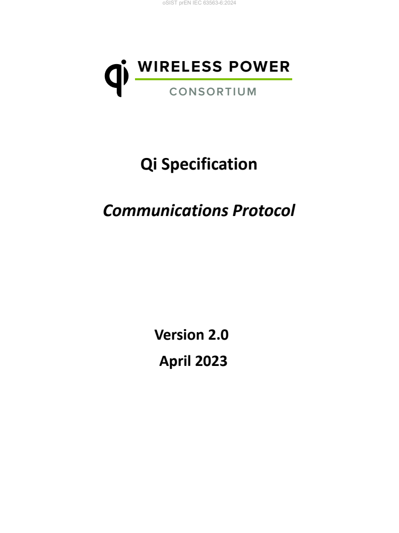 Keywords: EN IEC 63563-6:2025, Qi Specification version 2.0, Communications Protocol, wireless power, Power Transmitter, Power Receiver, data packets, Power Transfer Contract, FOD, Authentication.