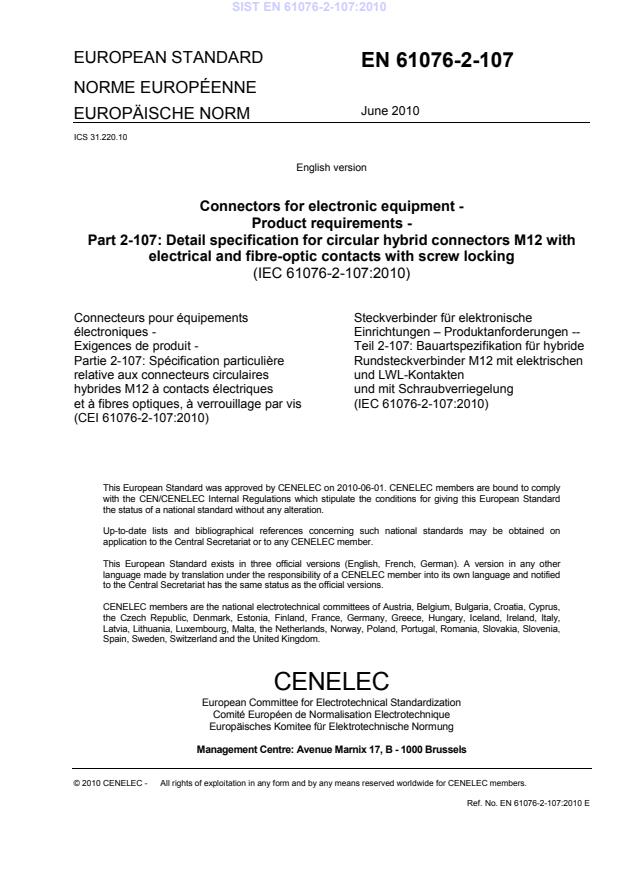 EN 61076-2-107:2010 is a standard published by CLC. Its full title is "Connectors for electronic equipment - Product requirements - Part 2-107: Detail specification for circular hybrid connectors M12 with electrical and fibre-optic contacts with screw locking". This standard covers: IEC 61076-2-107:2010 describes circular M12 connectors typically used for industrial process measurement and control. These connectors consist of fixed and free connectors with screw-locking as well as adaptors. The connectors are suitable to connect two optic fibres and two electrical wires intended for power transmission to the optionally integrated transmitter and receiver, not specified in this standard.