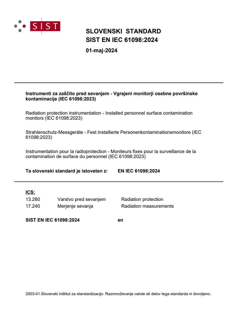 Instrumenti za zaščito pred sevanjem - Vgrajeni monitorji osebne površinske kontaminacije (IEC 61098:2023)