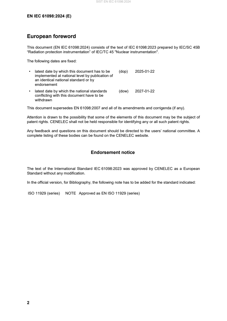 EN IEC 61098:2024 is a standard published by CLC. Its full title is "Radiation protection instrumentation - Installed personnel surface contamination monitors". This standard covers: This document applies to contamination monitors that include warning assembles and meters used for the monitoring of radioactive contamination on the surface of personnel whether they be clothed or not. The document is applicable only to that type of equipment where the user stays at the monitor. It is not applicable to the user passes quickly through the monitor. It is also not applicable to any peripheral equipment which may be associated with a particular type of equipment such as small article monitors. Probes (friskers) for measuring clothes or body by the person under monitoring or someone else are included in this document.