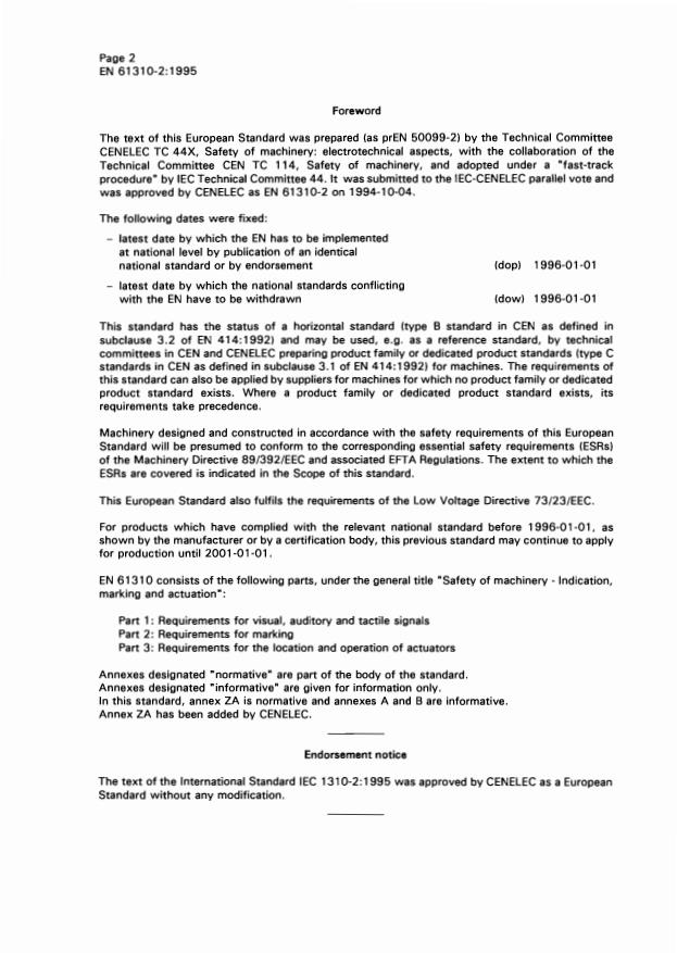 EN 61310-2:1995 is a standard published by CLC. Its full title is "Safety of machinery - Indication, marking and actuation - Part 2: Requirements for marking". This standard covers: Specifies requirements for the marking of machinery. Gives general rules for identification of machinery, for safe use related to mechanical and electrical hazards, and for the avoidance of hazards arising from incorrect connections.