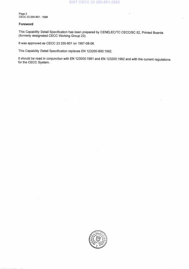 CECC 23 200-801:1998 is a Capability Detail Specification (CDS) published under CLC procedures for single and double-sided printed boards with plated‑through holes. It supersedes EN 123200-800:1992 and relates to CECC/SC 52 (disbanded). The specification defines the capability, acceptance and qualification expectations for manufacturers of printed circuit boards (PCBs) with metallized (plated) through-holes and was later adopted as SIST CECC 23 200-801:2002 in Slovenia. ICS classification: 31.180 - Printed circuits and boards.