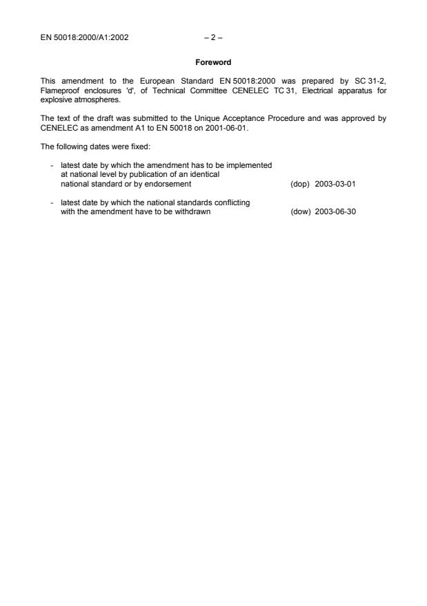 This amendment A1 modifies the European Standard EN 50018:2000; it was approved by CENELEC on