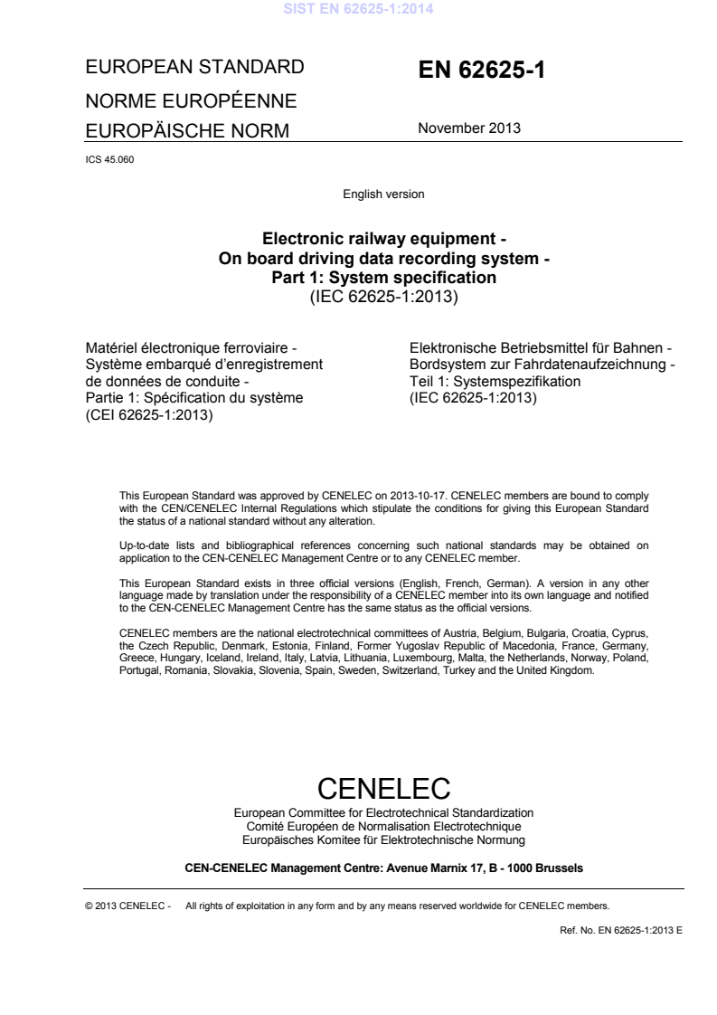 EN 62625-1:2013 is a standard published by CLC. Its full title is "Electronic railway equipment - On board driving data recording system - Part 1: System specification". This standard covers: IEC 62625-1:2013 covers the specification of an on board driving data recording system for the purpose of recording data about the operation of the train. The data refers both to the driver behaviour and the on board systems behaviour to support systematic safety monitoring as a means of preventing incidents and accidents. The data is recorded in a way that is suitable for identifying cause and where possible consequence, such that the data is suitable: - for investigative use in case of accidents and incidents; - to monitor the appropriate actions of drivers. This standard specifies the requirements for a universal recording system that is applicable to all types of rail vehicles.