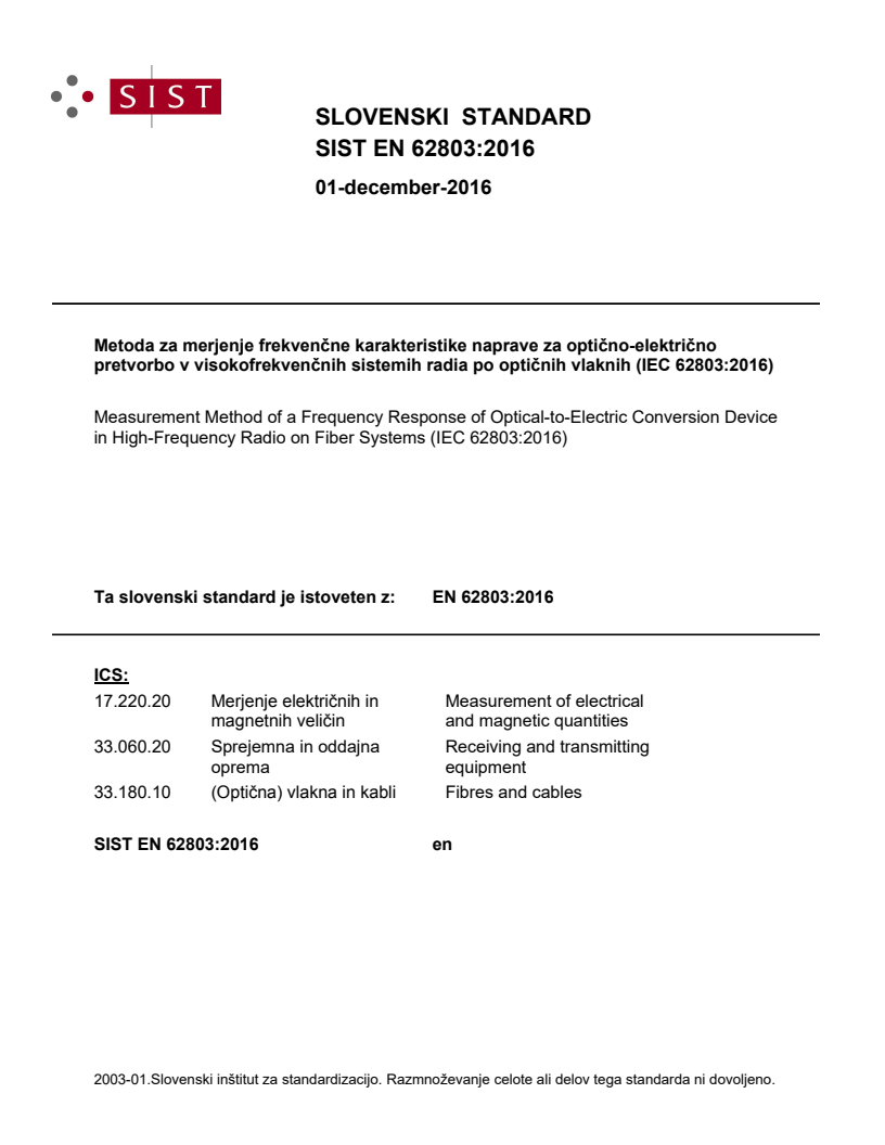 Metoda za merjenje frekvenčne karakteristike naprave za optično-električno pretvorbo v visokofrekvenčnih sistemih radia po optičnih vlaknih (IEC 62803:2016)