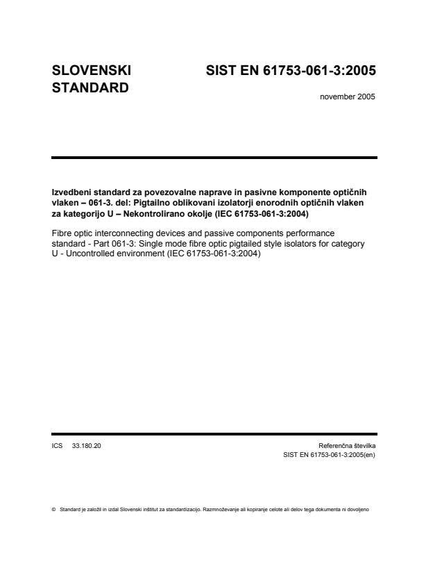 Izvedbeni standard za povezovalne naprave in pasivne komponente optičnih vlaken – 061-3. del: Pigtailno oblikovani izolatorji enorodnih optičnih vlaken za kategorijo U – Nekontrolirano okolje (IEC 61753-061-3:2004)